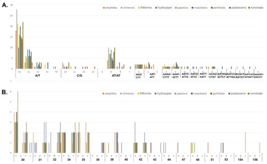 Simple sequence repeats (SSRs) were detected using MISA [32]. P. amphibia had 38 repeats. P. chinensis had the highest number of SSRs (59), whereas P. amphibia and P. pubescens (38) had a smaller number of SSRs than other Persicaria species. Most SSRs were A/T mononucleotide repeats (Figure 4A).