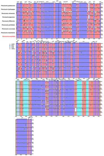 The cp genomes of nine Persicaria species were compared using mVISTA [33]. The results show that protein-coding genes were more conserved than the non-coding regions, and SC regions had lower variation than IR regions (Figure 5).