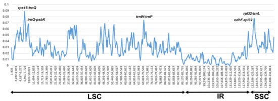 The number of polymorphic sites and nucleotide diversity were determined using DnaSP [34]. In the complete cp genome, there were 8470 polymorphic sites, and nucleotide diversity (Pi) was found to be 0.02746. The Pi value was calculated with 200 bp steps. These values ranged from 0 to 0.08875 (Figure 6). The high divergence regions were rps16-trnQ, rpl32-trnL, trnW-trnP, trnQ-psbK, and ndhF-rpl32, three of which (rps16-trnQ, trnW-trnP, and trnQ-psbK) were located in the LSC region, and two (rpl32-trnL and ndhF-rpl32) were located in the SSC region. The rps16-trnQ region exhibited the highest nucleotide diversity (0.0875, Figure 6).