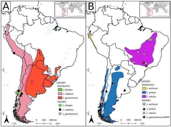 Maps depicting the currently recognized ranges for Lycalopex species (based on IUCN data). For clarity, three species are shown on panel (A) and three species on panel B (see internal legends for details). On panel (B) the geographic origins of the two L. vetulus individuals with L. gymnocercus mtDNA haplotypes are shown in red.