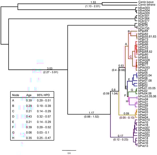 Bayesian chronogram for South American foxes. Values above branches indicate the age of the adjacent node, while those below branches are the respective 95% credibility interval (based on the 95% Highest Posterior Density (HPD) range). Letters indicate nodes whose age is listed in the inset box. Species-level branches are colored as in Figure 2.