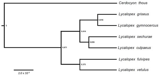 Species trees inferred with * BEAST for genus Lycalopex. The Bayesian posterior probability of each clade is indicated next to the defining node.