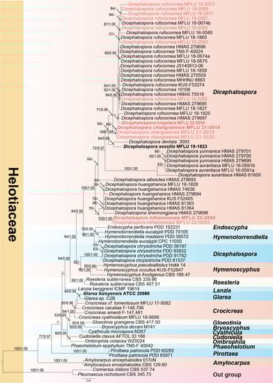 | Dicephalospora rufocornea | MFLU 19-2083 * | MZ241825 | MZ241816 | In this study |