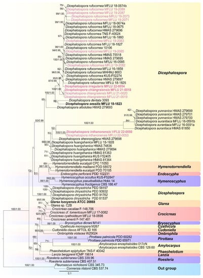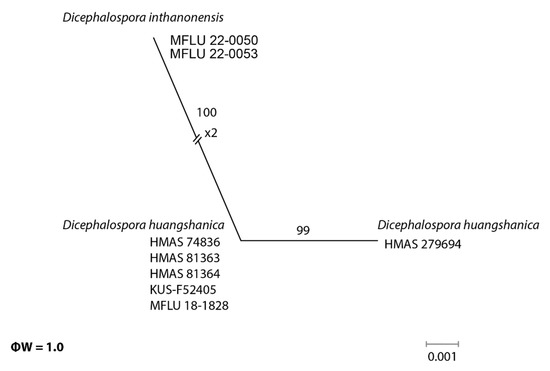 | Dicephalospora inthanonensis | MFLU 22-0053 * | ON606313 | ON604635 | In this study |