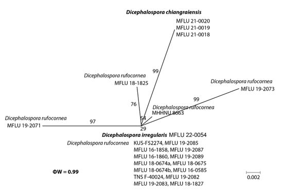 The genealogical concordance phylogenetic species recognition (GCPSP) model with a pairwise homoplasy index (PHI) test was used to analyze new species and the most closely related species [27]. The recombination level within phylogenetically closely related species was determined by the PHI test performed in SplitsTree4 [28,29]. The PHI analysis was conducted separately for each single loci and the combined LSU and ITS dataset. Two separate analyses were performed for Dicephalospora chiangraiensis and Dicephalospora inthanonensis, along with their most closely related taxa. The relationships of these two species were visualized in split graphs with both the LogDet transformation and splits decomposition options. A pairwise homoplasy index below the 0.05 threshold (ϕw < 0.05) indicated the presence of significant recombination in the dataset.