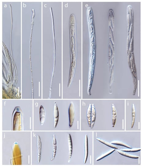 - Wijayawardene, N.N.; Hyde, K.D.; Lumbsch, H.T.; Liu, J.K.; Maharachchikumbura, S.S.N.; Ekanayaka, A.H.; Tian, Q.; Phookamsak, R. Outline of Ascomycota: 2017. Fungal Divers. 2018, 88, 167–263. [Google Scholar] [CrossRef]