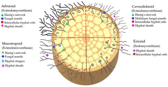 The classification of mycorrhizae by type of infection that has been described so far in Ericaceae includes ectomycorrhizae, ectendomycorrhizae, and endomycorrhizae. Ectendomycorrhizae can be of the arbutoid, monotropoid, and cavendishioid type; endomycorrhizae are of the ericoid and arbuscular type. Of these clades, the ectomycorrhizae and ectendomycorrhizae (arbutoids, monotropoids, and cavendishioids) form a multilayered mantle of hyphae around the root, while the ericoids, in contrast to the previous ones, develop their intra- and intercellular structures (Figure 2) [12].