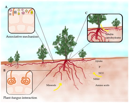 The recognition mechanism of an associated fungus for the formation of mycorrhizae involves many factors, such as the accumulation of phenolic compounds in the area of attempted penetration of a fungus, organic acids, volatile organic compounds, and phytohormones to initiate communication with plants, the chemotropic attraction between plants and fungi, recognition and subsequent adhesion of fungal infection structures to plant surfaces and their possible control by a balance of elicitors and suppressors, produced by the same fungi (Figure 3) [24]. For example, when the plant–fungus association is being established in ectomycorrhizae, the production and export of proteases, ligninases, and phenol-oxidase enzymes increase; there is also a slight increase in the production and export of enzymes in soil, which help break down soil waste and provide access to the nitrogen and carbon trapped within. Furthermore, the activities of these enzymes contribute to the formation of more hummus. Selected ectomycorrhizal fungi produce fatty acid esterase, an extra cellular enzyme, which degrade cuticle of plant litter thereby contributing to decomposition processes and to unmasking of nutrients [25]. Arbutoids associated with ericaceous plants may receive photosynthates from neighboring plants through shared mycorrhizal associations [24]. Likewise, ericoid and arbuscular mycorrhizae are known to mediate underground plant-to-plant signaling. In addition, arbuscular and ectomycorrhizal mycorrhizal fungi mediate the recognition of plant relatives [26]. The hyphae of ericoid mycorrhizae intercept the plasmodesma to obtain soluble carbohydrates, such as mannitol, trehalose, and hexoses, so that host invertases may not be necessary for the utilization of some sugars such as glucose and sucrose [27]. Carbohydrates such as glucose and mannose may play an important role in the adhesion process between the fungus and the plant [28].