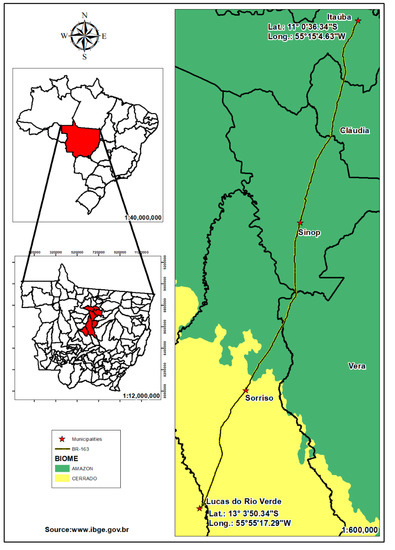 Land-use change due to agriculture and livestock expansion, together with infrastructure implementation, has caused severe biodiversity loss in the Amazonia–Cerrado transition zone [1,2]. The state of Mato Grosso has become one of the most active deforestation frontiers in Amazonia in recent decades [3,4]. Most of this deforestation has been caused by cattle farming and increased soy production in the early 2000s [5,6]. In 2016, agribusiness contributed more than 45% of the domestic product of Mato Grosso, which is the leading state of Brazil (GDP) (IMEA 2018), producing 27.25% of the country’s total grain within an area of 9.52 million hectares according to CONAB (https://www.conab.gov.br/info-agro/safras/graos/ (accessed on 1 February 2022)). Transportation of the grain is carried out on roads, mostly to the port of Santos, SP (approximately 45%), and nearby ports in the State of Pará (30%) [7]. The BR-163 highway (Cuiabá, MT-Santarém, PA) was constructed in the early 1970s [8] and is still the main access route through the central and northern regions of Mato Grosso.
