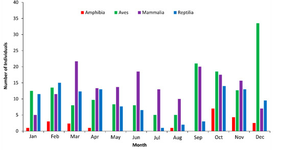 Environmental seasonality affects the frequency of roadkills [30]. Many studies point out that they may occur more frequently in the wet season [31,32,33,34] than in the dry season [23,35,36]. The numbers of reptile and amphibian roadkills are commonly higher in the wet season as this is the period of greatest activity for these groups [37]. Meanwhile, birds require a greater sampling effort than the other groups [38] and therefore rarely present any pattern related to seasons [30]. Medium and large mammals are generally not influenced by the seasons [39], except for carnivores, which show seasonal patterns related to specific phases of their life cycles (e.g., birth, dispersal, and reproduction) [24].