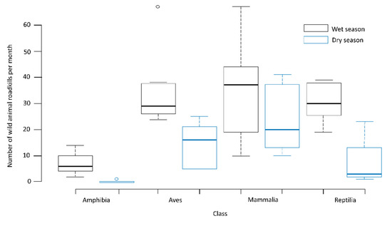 There was no significant difference in the number of roadkills between the wet and dry seasons for mammals. The number of roadkills was the highest in the wet season for amphibians (z = 2.068, p = 0.029), reptiles (z = 3.018, p = 0.002), and birds (z = 1.025, p = 0.041) (Figure 3).