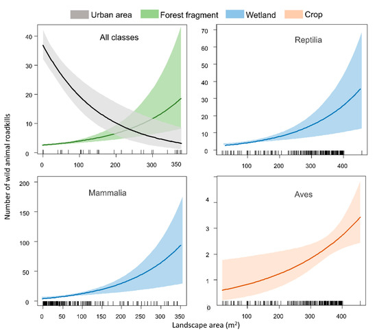 In general, our analyses showed that all classes combined have a positive relationship with forest fragments (z = 4.950, p < 0.0001; Figure 4) and a negative one with urban areas (z = −4.692, p < 0.0001; Figure 4). For Mammalia and Reptilia, we found a positive relationship with wetlands (z= 2.420 and p = 0.015 and z = 2.723 and p = 0.006, respectively; Figure 4). Birds showed a positive relationship with crops (z = 2.516, p = 0.0119; Figure 4).