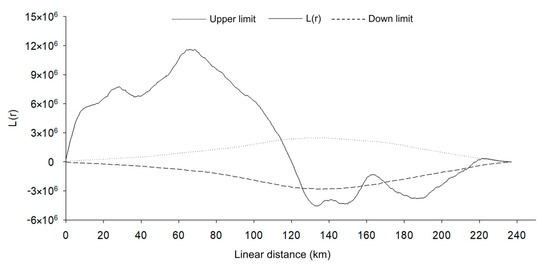 L(r) values above the confidence limits show scales with significant groupings, and values below these limits show scales with significant dispersion [64]. The initial radius used was 100 m, with a radius increment of 500 m (488 segments), one thousand simulations, and a confidence limit of 95% (modified from Coelho et al. [39], Cáceres et al. [33], and Teixeira et al. [40]).