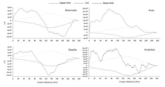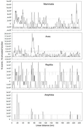 Location of roadkill hotspots for the classes Mammalia, Aves, Reptilia, and Amphibia on the BR-163 highway in the Amazonia–Cerrado transition zone, Mato Grosso, Brazil. Solid black line: N events—N simulated function; dotted lines: upper confidence limit; dashed lines: lower confidence limit.