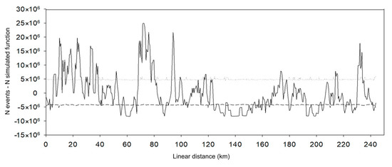 Location of roadkill hotspots on the BR-163 highway in the Amazonia–Cerrado transition zone, Mato Grosso, Brazil. Solid black line: N events—N simulated function. Dotted line: upper confidence limit; dashed line: lower confidence limit.