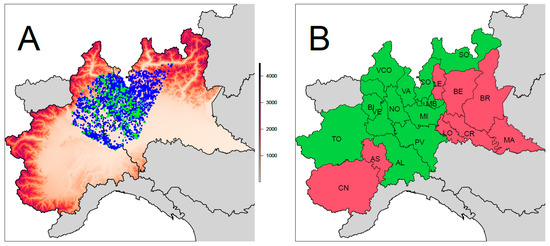 Study area. (A) Light/dark red indicates low/high elevation (m a.s.l.), and borders of the Italian regions are shown in black. Japanese beetle locations are green; observer-oriented pseudo-absences (i.e., locations of species other than target species collected by the observers of the target species) are blue. (B) Green and red polygons indicate provinces with and without the occurrence of our target species, respectively. In Lombardy: BE, Bergamo; BR, Brescia; CO, Como; CR, Cremona; LE, Lecco; LO, Lodi; MA, Mantua; MB, Monza-Brianza; MI, Milan; PV, Pavia; SO, Sondrio; VA, Varese. In Piedmont: AL, Alessandria; AS, Asti; BI, Biella; CN, Cuneo; NO, Novara; TO, Turin; VCO, Verbania Cusio Ossola; VE, Vercelli.