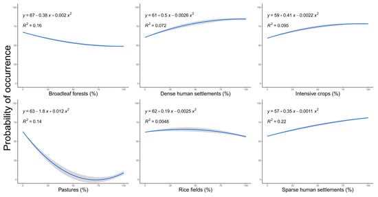 Considering these reaming predictors, we found that Pj was negatively related to the percentage of broadleaf forests and pastures, while it was positively related to sparse and dense human settlements as well as intensive crops (Figure 2). The occurrence of Pj slightly increased in relation to the percentage of rice fields until a peak at around 50% (Figure 2).