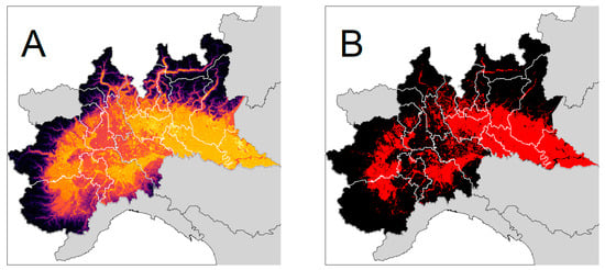 Thus, we estimated that 16,000.02 km2 (32.49%) of our study area was potentially suitable for Pj, mainly located in the Po Valley in Lombardy (Figure 3). The most suitable areas for Pj were located in Lombardy, especially in the provinces of Milan, Monza–Brianza, Lodi, Cremona, and Mantua as well as the lowest part of the provinces of Bergamo and Brescia. Pavia was one of the provinces least affected by the presence of Pj. However, there was a range of high suitability for the species located in a pre-Apennine area parallel to the course of the Po River. This area continues through part of the province of Alessandria in Piedmont. Generally, the distribution of Pj should be relatively limited in Piedmont compared with that in Lombardy. However, we identified large areas of distribution of Pj in the pre-alpine areas of Piedmont, specifically in the provinces of Cuneo, Turin, and Vercelli (Figure 3).