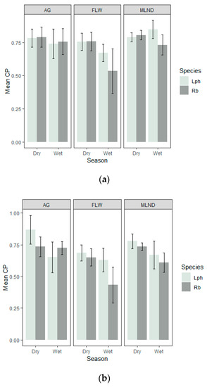 Moreover, diet diversity (Shannon Index) significantly differed between species (F1,9 = 15.06, p = 0.004) but not between seasons (F1,9 = 0.06, p = 0.814) and habitats (F2,8 = 0.76, p = 0.5). In addition, there was a considerable niche overlap in the diets of L. acquilus and R. dilectus across habitats and seasons, ranging from 0.84 to 0.98. However, niche overlap in the diets of both L. acquilus and R. dilectus was much greater during the dry season than the rainy season (Table 5).