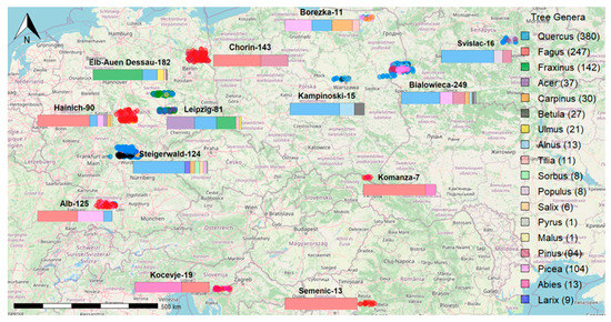 The map of study sites in Central Europe shows an almost representative coverage. Trees fogged were plotted and visualised as differently coloured dots, which were jittered for better visualisation. The coloured bar graphs show the percentage of tree genera fogged per site, together with the total number of foggings in brackets. All sites with seven trees, or more, are shown.