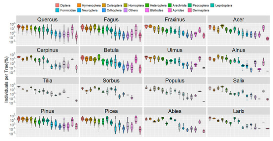 Violin plots with overlayed boxplots show how much arthropod taxa contribute to the canopy communities in the tree genera investigated. Compact violins indicate low variance in numbers, while extended violins show high betweensample variability. Tree genera are sorted according to the number of foggings; taxa are sorted according to the median. Quercus and Pinus were used as a reference for deciduous and coniferous trees, respectively. Two trees fogged in only one individual (Malus and Pyrus) are not displayed.