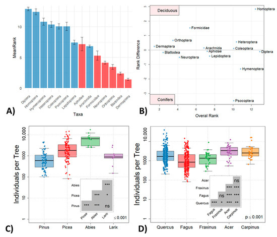 (A) Arthropod taxa were arranged in a distinct rankorder on the trees, as visualised by mean ranks with standard errors (+/− 1 standard error of the mean), with the highest rank equal to 14. “Major taxa” are in blue; “minor taxa” are in red (see text) (B). Plotting the rank differences of taxa on deciduous and coniferous trees emphasises taxa preferences. The further to the right a taxon is on the x-axis, the more often it was found in a high rank; the further up or down on the y-axis, the more taxa were preferentially collected from deciduous or coniferous trees. (C,D) show the overall distribution of arthropods on conifers and deciduous trees; both indicate overall differences within deciduous trees and conifers (Kruskal Test, p < 0.001). The difference in the means of all tree genera was compared, and the associated adjusted significance levels are displayed in the inlays (Wilcoxon test with multiple testing correction), p < 0.05 (*), p < 0.01 (**), p < 0.001 (***).