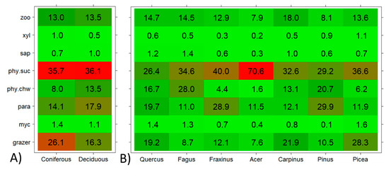 Relative proportions of beetles per feeding guild on deciduous and coniferous trees (Picea and Pinus (A)) and on tree genera (B). The darker the shade of green, the greater the proportion of the particular guild; the highest values are shown in bright red. We used only tree genera with at least 10 fogged trees in the analyses. The total number of foggings was 319.