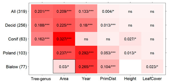 Results of the (adonis) regression models of guild composition, showing R2 values for significant coefficients based on different study strata (y-axis), with the number of fogged trees in brackets. On the x-axis, the R2 with the associated significance level is shown. Dropped factors are indicated by white boxes, while non-significant factors are depicted with “ns”. For the condensed Bialowieza model (Bialow) only, we used the coordinates of each sampled tree as numerical factors in the model, in which only NorthSouth was weakly significant (R2 = 0.03 framed box for Area). The factor Height (tree height) was dropped in this model, due to strong collinearity with the factor Management. p < 0.05 (*), p < 0.001 (***).
