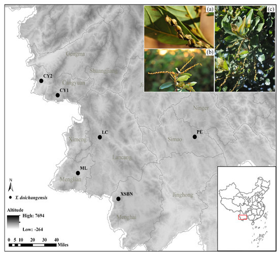 Sampling locations of T. doichangensis. (a,b) pistillate inflorescences of T. doichangensis; (c) leaf of T. doichangensis.