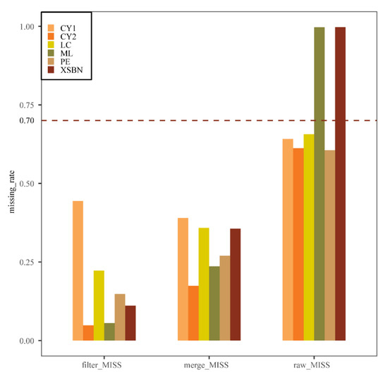 The missing SNP rate for each population without merging (raw_MISS); The missing SNP rate for each population after merging (merge_MISS); and the missing SNP rate for each population after filtering (filter_MISS).