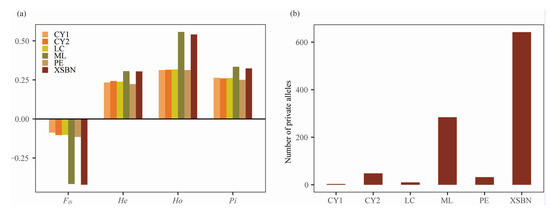 The results for the genetic diversity parameters of T. doichangensis are summarized in Table 2 and Figure 3. The observed heterozygosity (Ho) ranged from 0.3129 to 0.5571; the expected heterozygosity (He) ranged from 0.2232 to 0.3059; nucleotide diversity (Pi) ranged from 0.2504 to 0.3343; the inbreeding coefficient (FIS) ranged from −0.4213 to −0.0879 (Table 2). The ML population showed the highest genetic diversity (Ho = 0.5571; He = 0.3059; Pi = 0.3343; Table 2) followed by the XSBN population, and the PE population showed the lowest genetic diversity (Ho = 0.3129; He = 0.2232; Pi = 0.2504; Table 2). Furthermore, the XSBN population had the most private alleles, and the CY1 population had the fewest private alleles, while the FIS values of the six populations were negative, indicating that there was no inbreeding within the six populations.
