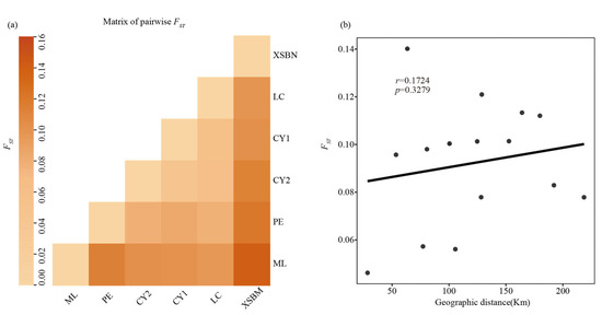 Pairwise FST for T. doichangensis populations (a) and the correlation between genetic distance and geographic distance (b).