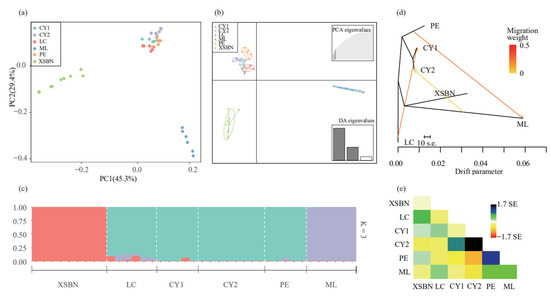 (a) Principal components analysis (PCA) plot generated for T. doichangensis. (b) Discriminant analysis of principal components (DAPC) plot generated for T. doichangensis. (c) Genetic structure bar plots at K = 3 from clustering analysis among six populations using Admixture. (d) Unrooted maximum likelihood phylogenies from ten iterations of three migration events. The variance of relatedness explained by this model was estimated to be 99.98%. The line represents gene flow; the direction of the arrow is the direction of gene flow; the color bar shows the migration weight, with red representing strong gene flow and yellow representing weak gene flow. The direction of gene flow was PE into ML, LC into CY1 and ML into CY2. (e) Residuals matrix for migration model.