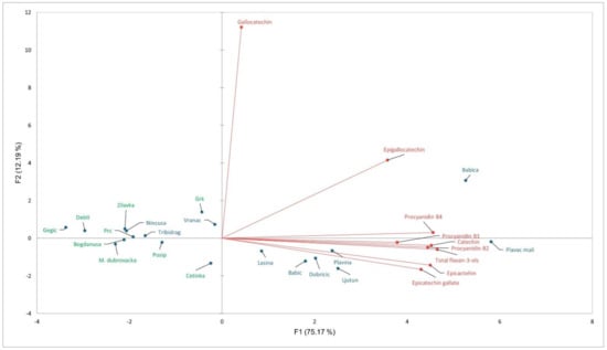 Half of the varieties are located near the x axis in the quadrants II and III, and most of these varieties are white varieties. A few of the red varieties are situated near white varieties, which are Nincusa, Tribidrag, and Vranac. When looking at their flavan-3-ol profile, these varieties have a similar profile to the white varieties. This means a low content of total flavan-3-ols comparing to the analyzed red varieties. The rest of the red varieties are situated in the IV quadrant. Two more varieties that are separated from the rest of the red varieties are Plavac mali and Babica. When looking at the vectors, these varieties have a higher content of all of the individual compounds, as well as the total flavan-3-ols. These results confirm the overall profile given in Table 3.