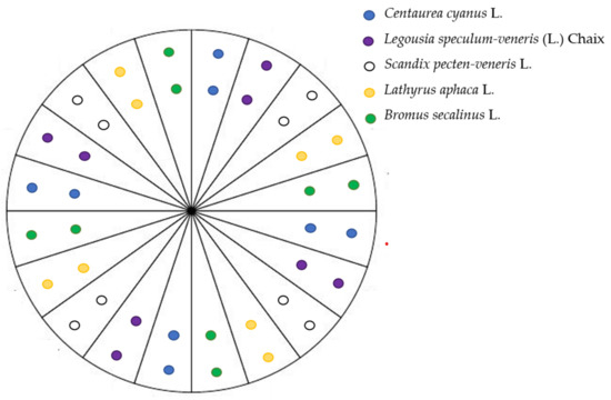 Sowing design for the five selected species in each of the 45 pots, simulating an arable plant community.