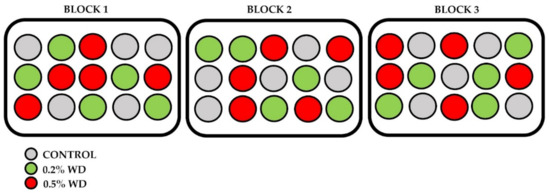 We sowed a total of 45 pots (15 pots × 3 treatments). Then, the pots were placed in a growth chamber at 22 ± 2 °C, 70 ± 1% RH, and 250 μM s−1 m−2 PAR with a day/night cycle of 16–8 h. We applied 3 different treatments: (i) 0% WD (control-C); (ii) 0.2% (v/v) WD (WD1); (iii) 0.5% (v/v) WD (WD2). The 0.2% and 0.5% concentrations are those recommended by the producer to be used on any crop growing in the open field [36]. To minimize possible microclimatic effects, we organized the pots into 3 blocks, each one containing 5 replicates (pots) per treatment (Figure 2). We applied treatments once a week, spraying the solutions (1.5 L for each of the sets of 15 pots) on the entire pot’s surface, following the procedure described by Vannini et al. [37]. The applications were performed outside of the growth chamber to avoid any type of contamination between the sets. After the treatment, the pots were stored back in the growth chamber and randomly rotated every three days inside each block. The experiment lasted 7 weeks, for a total of 6 WD applications.