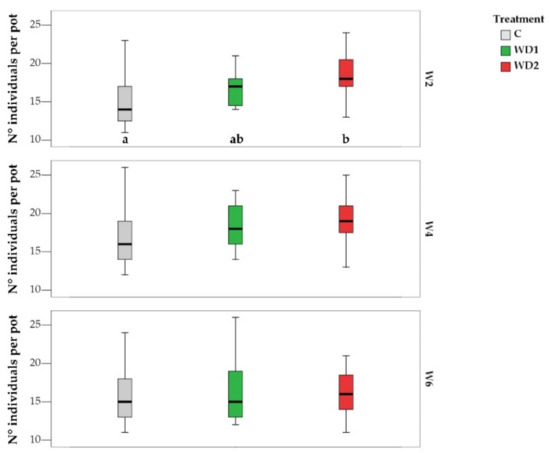 Boxplots showing the total number of individuals per pot per treatment (C = 0% wood distillate; WD1 = 0.2% wood distillate; WD2 = 0.5% wood distillate) at week 2 (W2), week 4 (W4), and week 6 (W6). Different letters indicate statistically significant differences (α = 0.05).