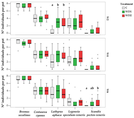Boxplots showing the total number of individuals of each species per pot per treatment (C = 0% wood distillate; WD1 = 0.2% wood distillate; WD2 = 0.5% wood distillate) at week 2 (W2), week 4 (W4), and week 6 (W6). Different letters indicate statistically significant differences between treatments for each species (α = 0.05). ° = outlier; * = extreme value.
