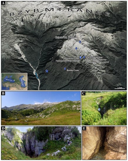 Souvenir Cave: With 1464 m length and −408 m depth, it is also located in the Khipsta Massif, with an entrance exposed at 1850 m a.s.l. (Figure 1C), south to the Khipsta Mountain, at a distance 0.4 km west to the huge entrance of Snezhnaya Cave (Figure 1D). Flowing streams and three siphons start from about −300 m, descending to the bottom part. Hydrologically, Souvenir Cave obviously belongs to the Snezhnaya Cave System [13], but terrestrial connection is yet unknown. Air and water temperature along the cave, in August 2018 and 2019, ranged from 2.8 °C to 5.7 °C.