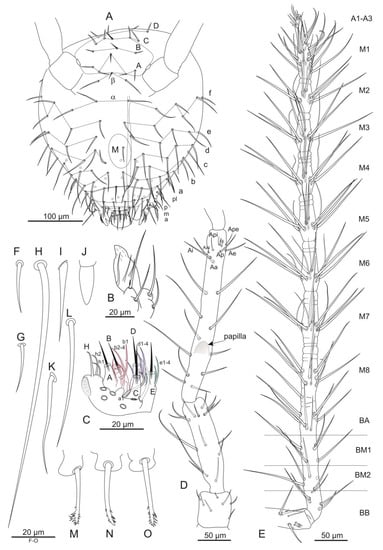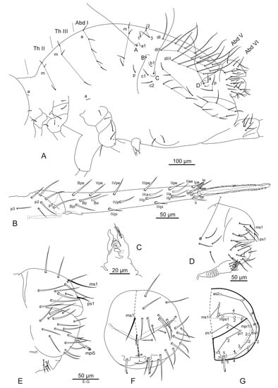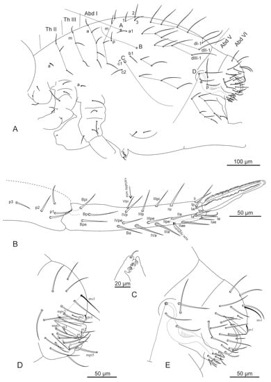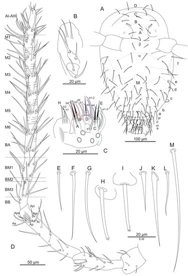 Chaetotaxy nomenclatures are used following Betsch and Waller [18] for the head, Fjellberg [19] for the mouthparts, Vargovitsh [9,20] for the great abdomen, Bretfeld [21] for the fifth abdominal segment and partly for great abdomen, Betsch [22] for the sixth abdominal segment, and Nayrolles [23,24,25] for appendages.