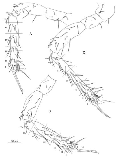 Arrhopalites profundus sp. nov. (A)—Chaetotaxy of foreleg; (B)—Chaetotaxy of midleg; (C)—Chaetotaxy of hindleg. Nomenclature of setae in (A–C): after [23].