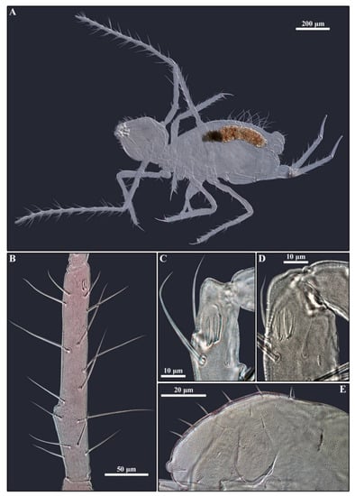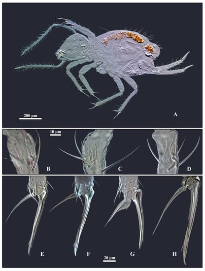 Legs. Foreleg (Figure 3A): precoxa 1 and 2 and coxa with 1, 0, 1 seta, respectively (Figure 4A). Trochanter with 3 anterior and 1 posterior setae. Femur with 11 setae, a4 turned perpendicularly to the longitudinal axis of the segment. Tibiotarsus with 42 setae, tibiotarsal formula: 9, 8, 8, 8, 6, 3; seta Ja of distal whorl I, curved and distinctly spine-like; whorl V without ai and pi setae; region F with primary setae e, ae, pe. Pretarsus with 1 anterior and 1 posterior setulae. Foot complex (Figure 5E,H). Claw: slender and much elongated (up to 148 μm), without tunica, with tiny inner tooth and a pair of long subapical lateral teeth; about 2× shorter than tibiotarsus. Empodium: thin, without corner tooth; 1.6× shorter than claw; tip of empodial filament not reaching tip of claw.