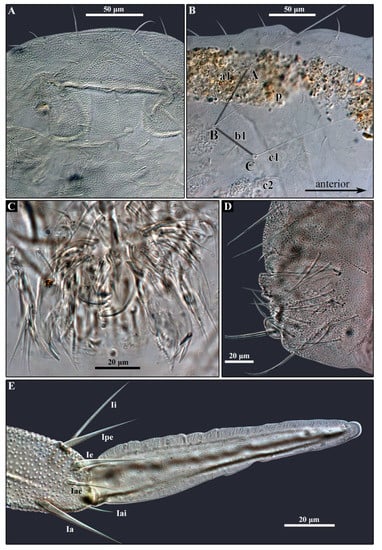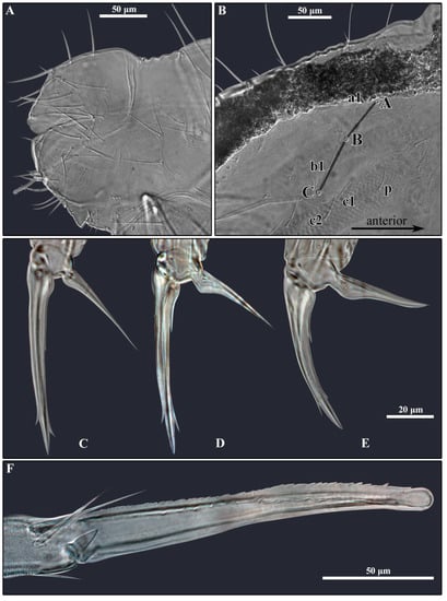 The sixth abdominal segment (Figure 4D and Figure 6D) without any cuticular spines. Dorsal valve with 10 + 2 axial + 10 setae. Each of the lateral valves bears 15 setae. Setae of the circumanal row are slender and not modified, with the longest = 47–56 μm, which is 1.7× shorter than posterior setae of the great abdomen (Figure 2F,G). Appendices anales (Figure 2H,I) (34–37 μm) rod-like, laterally smooth, apically not broadened, and denticulated; sitting on globular basal papilla.