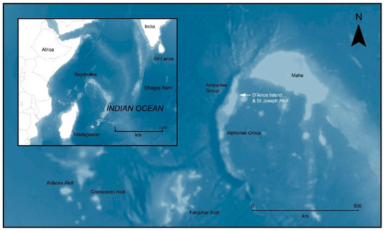Map displaying the D’Arros island and St Joseph atoll site, situated on the Amirantes bank, Republic of Seychelles. Inset displays broader geographic reference in Western Indian Ocean. Map created in ArcGIS 10.5 using GEBCO_08 bathymetry data: GEBCO Compilation Group (2020) GEBCO 2020 Grid (doi:10.5285/a29c5465-b138-234d-e053-6c86abc040b9).