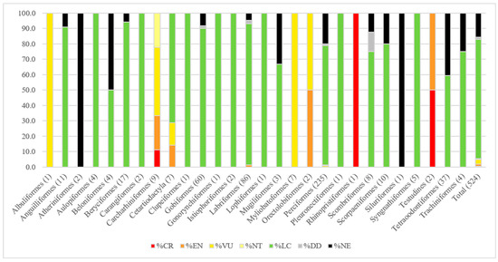Percentage of species in different Red List categories, arranged taxonomically, by order, with number of species in each order included in parentheses.