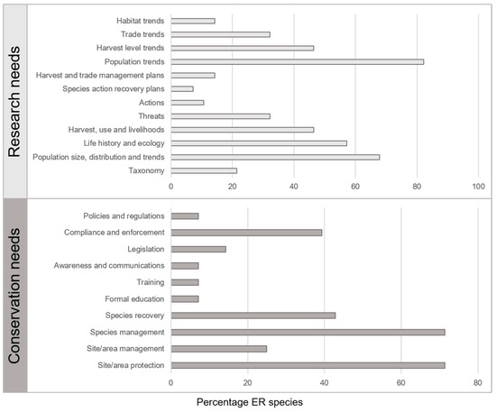 Listed research and conservation needs for all ER species, presented as percentage of species requiring a particular research or conservation action.