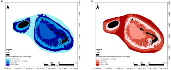 Species richness map of D’Arros and St Joseph for (a) all species and (b) ER species, with major marine habitat types displayed. Lighter to darker colour represents increasing number of species using the habitat type.