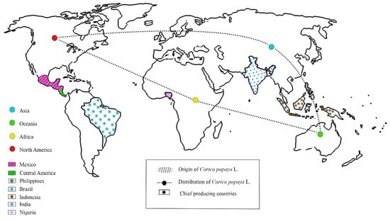 Carica papaya L. originated in southern Mexico, the Philippines, and Central America [3,4]. The Caribbean coast of Central America, Argentina, Chile, and southern Mexico were identified as the origins of papaya, resulting from natural hybridization between Carica peltata and other wild species [5]. Papaya is domesticated in tropical and sub-tropical regions of the world (Asia, Africa, Oceania, and North America). According to FAOSTAT 2020, the chief producers are India, Brazil, Mexico, Indonesia, and Nigeria. Figure 1 shows the origin, distribution, and cultivation of papaya. In 2011, researchers from the Philippines reported the development of PRSV-resistant papaya by crossing papaya with Vasconcella quercifolia. Papaya fruits are natural gifts, possessing a large proportion of vitamins, macro and micro minerals, bioactive substances, and secondary metabolites. In addition to fruits, the leaves, stems, seeds, and other plant parts are high in alkaloids and flavonoids, which have antimicrobial and medicinal properties. Their numerous medical benefits have been discovered over the years, making papaya a plant of considerable therapeutic relevance. Endopeptidases, papain, caricain, and proteinase enzymes found in papaya latex are important industrial enzymes used in many commercial applications.