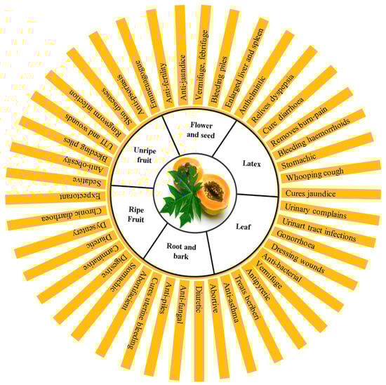 However, Nisar et al. (2011) found that papaya leaf extracts could be used to treat dengue fever [26]. Papaya leaves can be used for malaria treatment owing to the presence of several alkaloids, including quinine, which has been proven to be an anti-malarial agent [27]. The ‘chikungunya’ vector is another causal agent that poses a health risk. The combination of papaya leaf extract with spinosad (a bacterial insecticide) has proven to be a helpful and environmentally friendly treatment. The larvicidal and pupicidal effects of this bacterial insecticide dominate the vector. Papaya methanolic leaf extract has a significant larval and pupal mortality rate [28]. Additionally, the Table 1 summarizes scientific reports on the pharmaceutical properties (using human and animal models) of papaya latex, fruit (ripe or unripe), leaf, root, flower, and seed extracts.