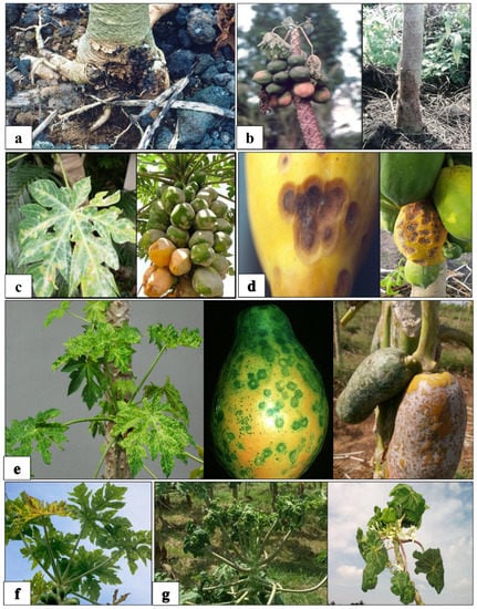 Fungal and viral disease in papaya. (a) Stem rot in papaya due to Pythium aphanidermatum. (b) Infected stem and malformed apical portion caused by Phytophthora palmivora. (c) Infection in leaves and fruits caused by Oidium caricae. (d) Fruits affected by fungus Colletotrichum gloeosporioides. (e) Ring-shaped spots on leaves and fruits due to PRSV. (f) Leaves affected by PMV and (g) curly leaves symptoms due to PLCV.